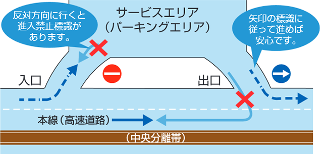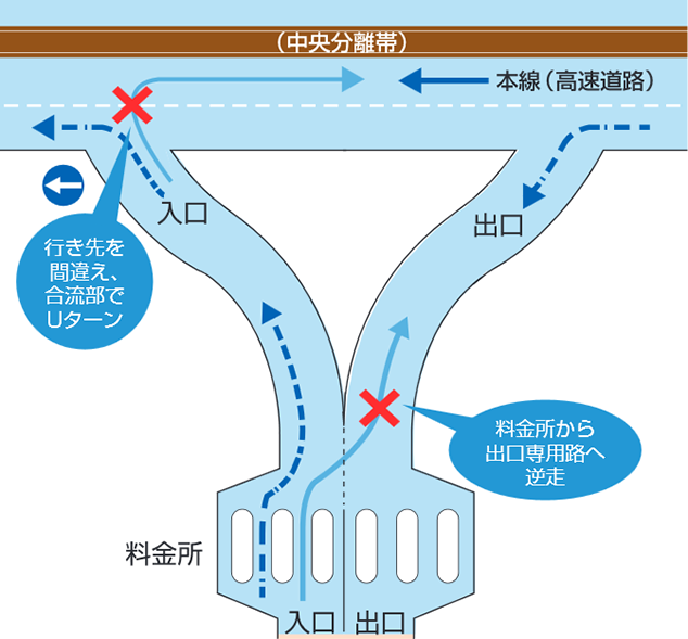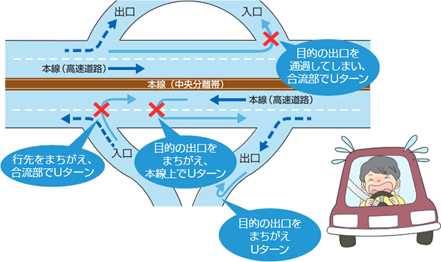 高速道路は一方通行。Uターン、バックは厳禁です。