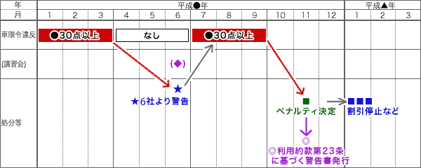 例:累積違反点数180点⇒一部利用停止(3か月)、210点⇒一部利用停止(4か月)など