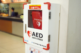 AEDの設置個所をご案内します。AEDは突然心停止状態に陥ったときに装着して用いる救命装置です。訓練を受けたスタッフだけでなく、お近くのお客さまなど誰でも利用することができます。