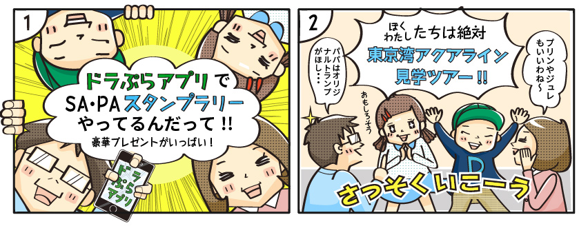 NEXCO東日本会社発足10周年を記念して、 関東エリア限定『SA・PA スマホ・スタンプラリー』を開催致します。 対象休憩施設に設置してあるハイウェイスタンプを5つ以上集めると豪華賞品が当たるチャンス♪ さらに・・・ ゲームに勝つとその場で貰えるオリジナルグッズも! 車の旅の思い出に、是非スタンプラリーにご参加ください。