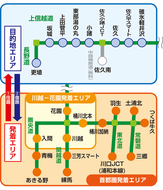 - 往路・復路ともにエリア外からご利用の場合、一度高速道路を降りてエリア内のICから乗り直してください。