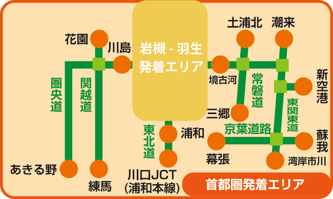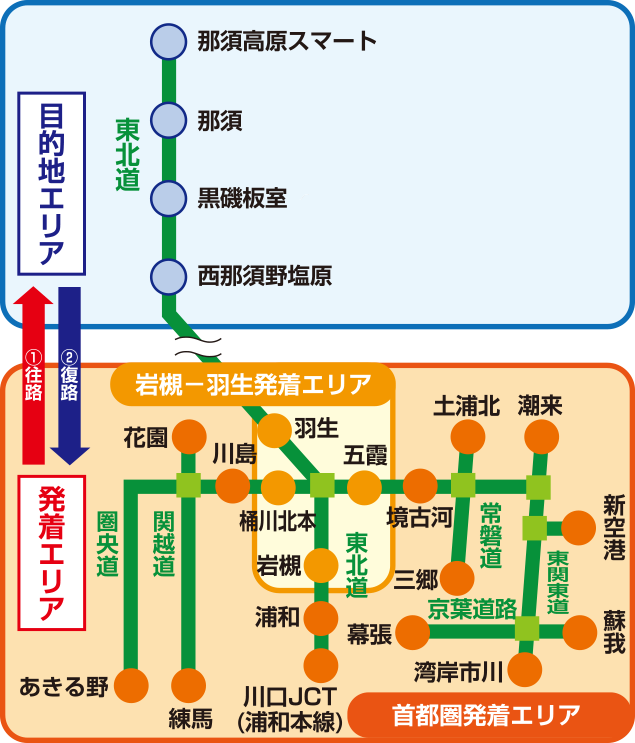 - 首都高速・外環道を経由した場合、関越道・東北道・常磐道・東関東道への入口となる本線料金所が往路の入口となるため、乗り直しは不要です。(本線料金所までの料金が別途必要です)