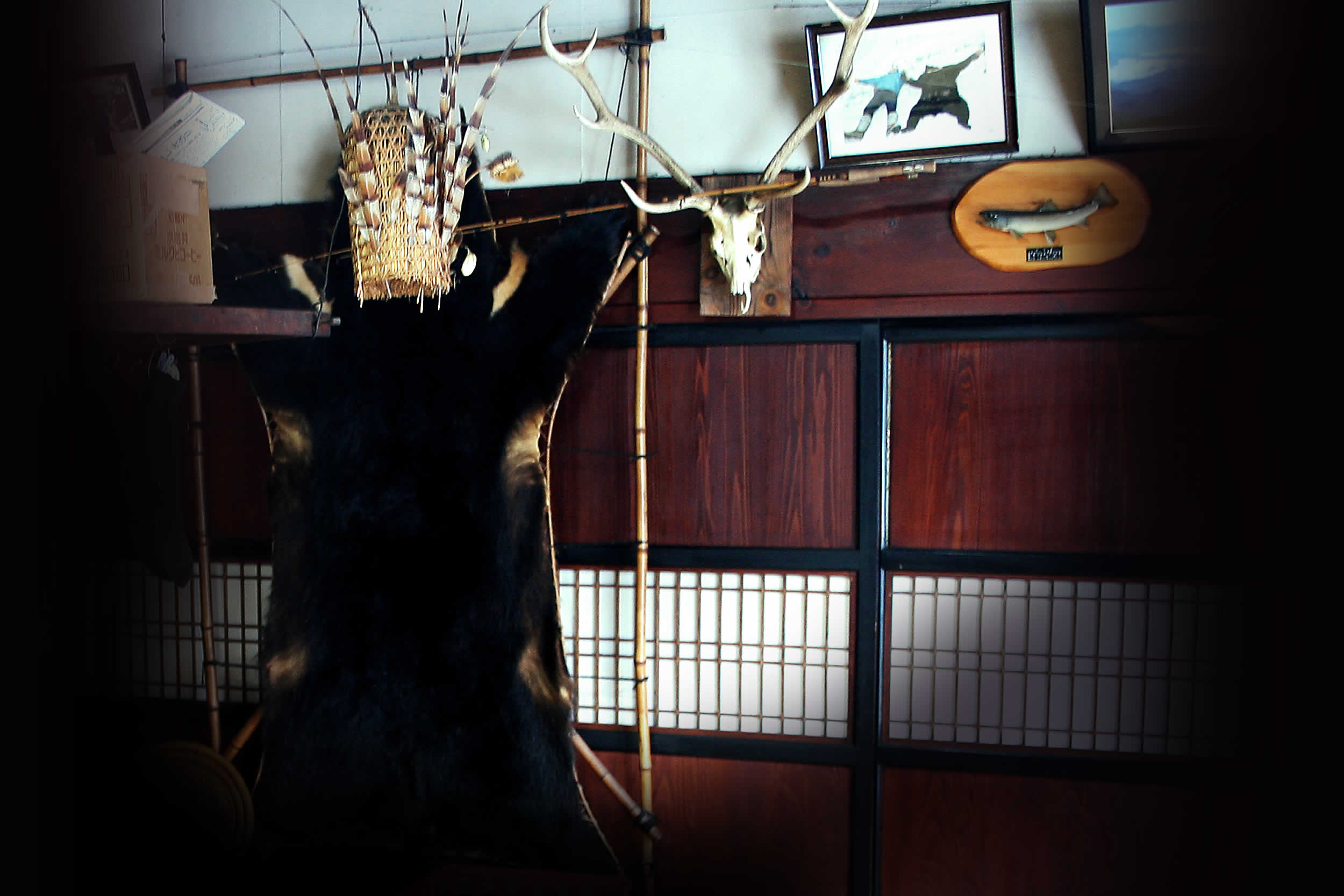 玄関を入ってすぐの大広間には大きな熊の毛皮や鹿の頭蓋骨が飾ってあって、昔話の世界に迷い込んだような気分になる。宿のご主人、横山さんもマタギなのだ。