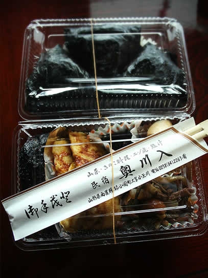 その前に、宿の女将さんからお握りが3つとおかず満載のボリュームたっぷり弁当を受け取った。