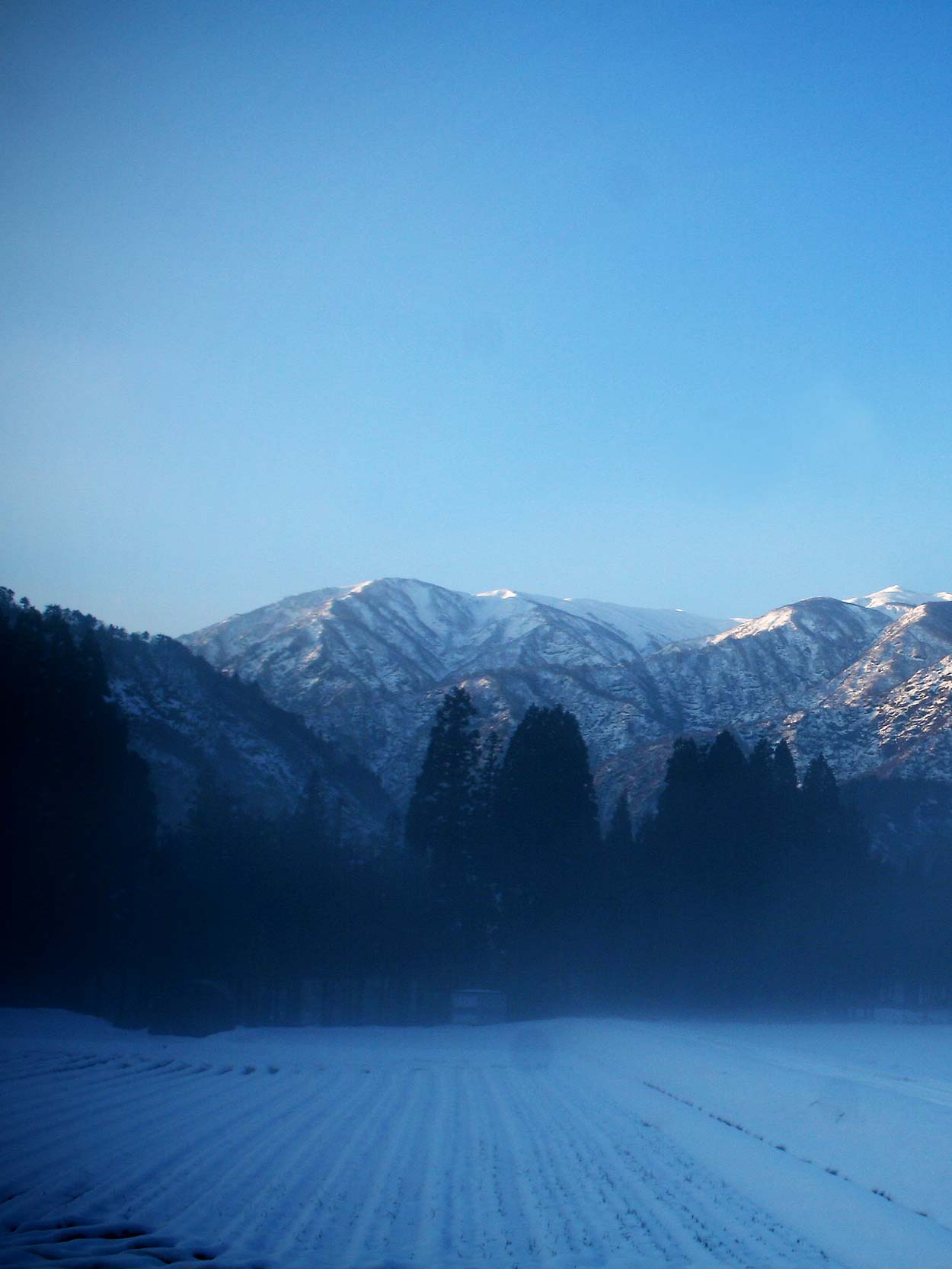宿の前の畑とその後ろにそびえる飯豊連峰が真っ白な雪化粧をまとう。