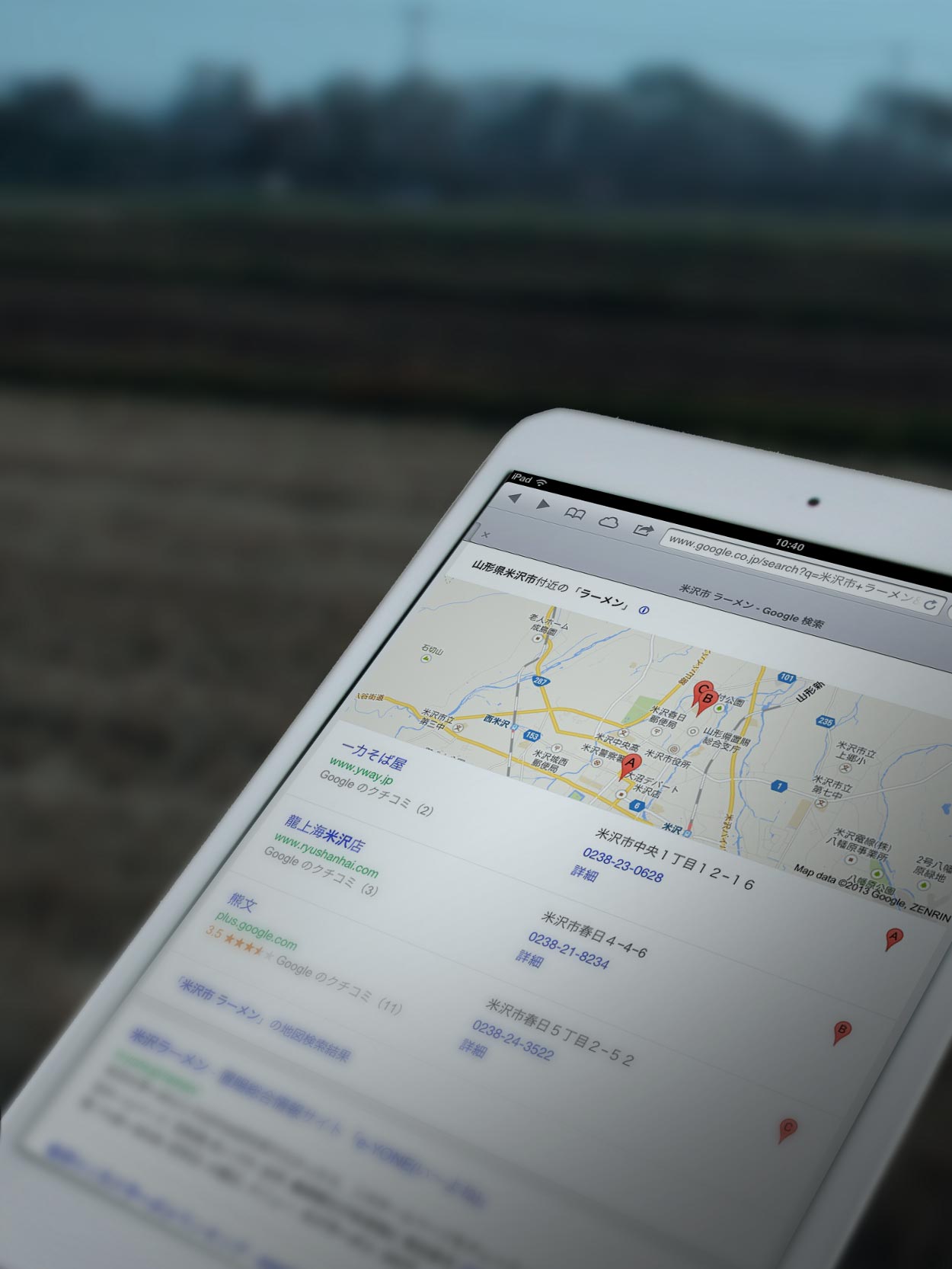 農道の脇に車を停め、持っていたi padで米沢市内のラーメン屋を検索。
