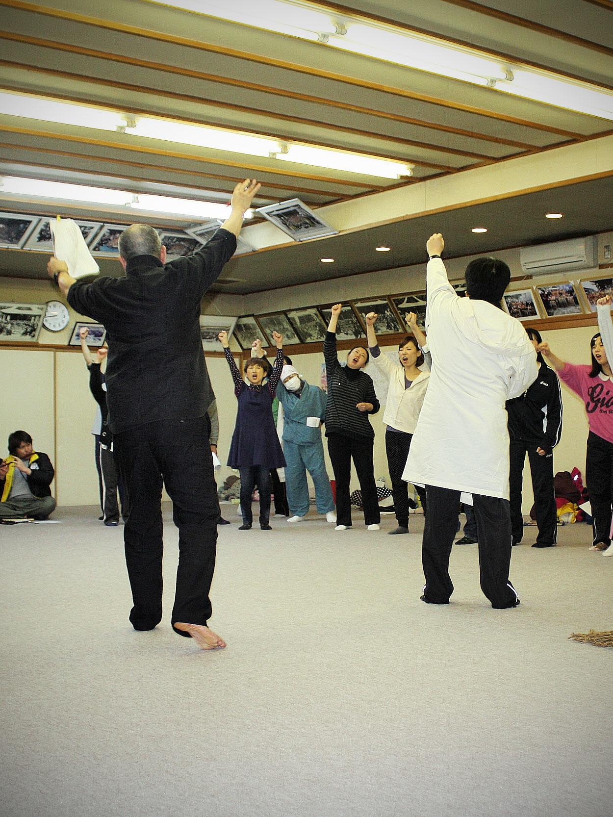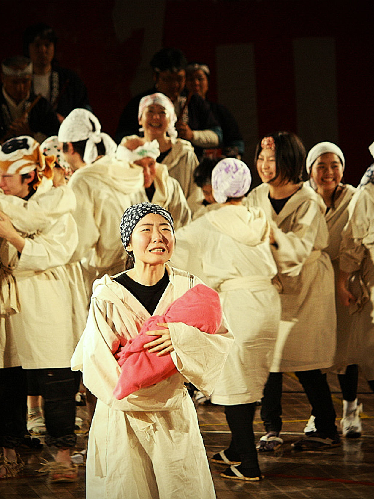 実はあの「鬼のような」風貌の男性は、有名な劇作家・演出家であり劇団「渡辺源四郎商店」店主でもある畑澤聖悟氏。ここ「鬼沢研修会館」で始まったのは、2014年3月23日に公開される、津軽ふるさと創成劇「鬼と民次郎」の稽古だったのだ。