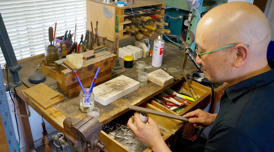 金槌や型などの工具もすべて角居さんの手作り。そこまでやる金属造形作家は角居さんだけではないでしょうか。どうして金属で生きる道を選んだのか、そのキッカケを聞いてみると。