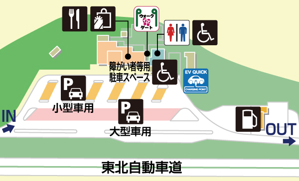 岩手山SA・下りでご利用いただける、各種施設・サービスのご紹介です。