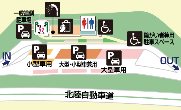 - 障がい者等用駐車場の設置、オストメイト対応トイレの整備等、バリアフリー化が行われているサービスエリアです。