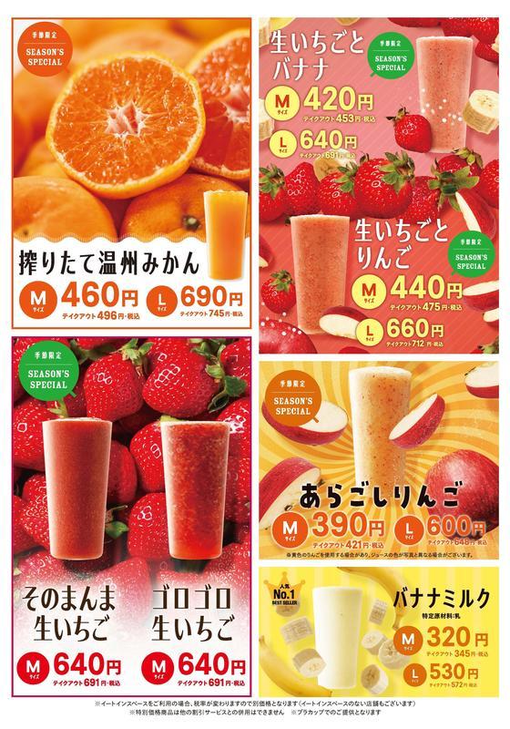 季節によって異なりますが、各種新鮮な搾りたてのフルーツジュースを提供しております。"飲むフルーツ"で皆様方の笑顔と健康をおいしくサポートいたします。