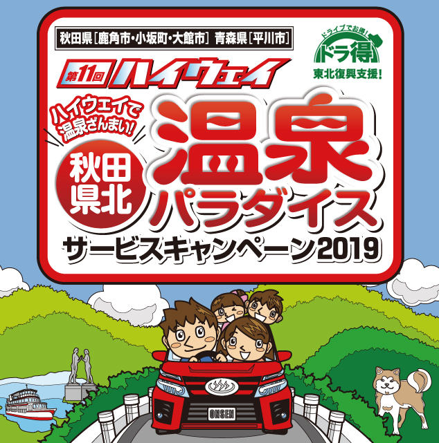 「秋田県北温泉パラダイスサービスキャンペーン2019」では、入浴ご利用券にETCカード、または、高速道路利用証明書のご提示で、対象温泉施設のご入浴が割引に!