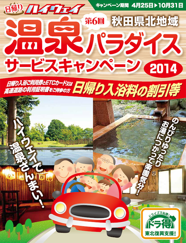 高速道路を利用して、のんびりゆったり秋田県北地域の温泉をお得に楽しんでいただけるよう「ハイウェイ秋田県北地域日帰り温泉パラダイスサービスキャンペーン2014」を実施中です。