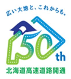 「50」と北海道の地図を図案化したデザインで、色彩は、自然豊かな北海道をイメージし、大地の緑のグリーンから広い空・海のブルーへのグラデーションを基調としています。