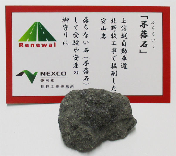 このお守りは、上信越自動車道・北野牧岩塊掘削工事で"落ちなかった"岩石を使って作られ、「落ちない」祈願の意味を込めて受験生を応援するために生まれました。受験生ご本人はもちろん、学校やご家族の方々からも高い関心をお寄せいただき、横川SAでの配布は連日多くの方にお立ち寄りいただきました。