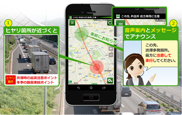 - 高速道路の進行方向に存在するヒヤリハット箇所(事故多発地点)を音声+メッセージで事前に通知します。