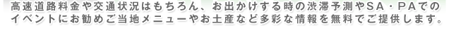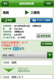 出発IC、目的地IC、経由地IC(複数経由を指定可能)を入力て、高速道路における経路、料金、所要時間(渋滞予測を加味)を検索できます。