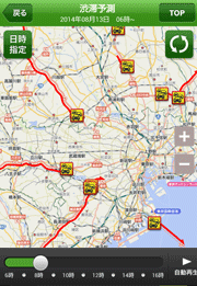 指定日時の渋滞予測を地図上で表示でき、さらに1時間毎にスライドして表示ができるので、渋滞ポイントの流れがわかります。