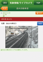 気象情報は天候・路面状態・降雪量・風向き風速などが3時間単位で24時間先まで表示され、「ライブカメラ」では現在の高速道路の路面状態や天候を静止画像で確認できます。