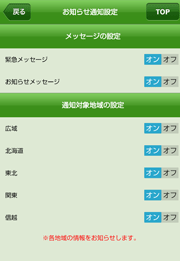「各種設定・その他」-「お知らせ通知設定」でメッセージの設定をオンにしておくと、通行止め情報や災害情報などのメッセージやお得なお知らせ情報がPUSH通知されます。