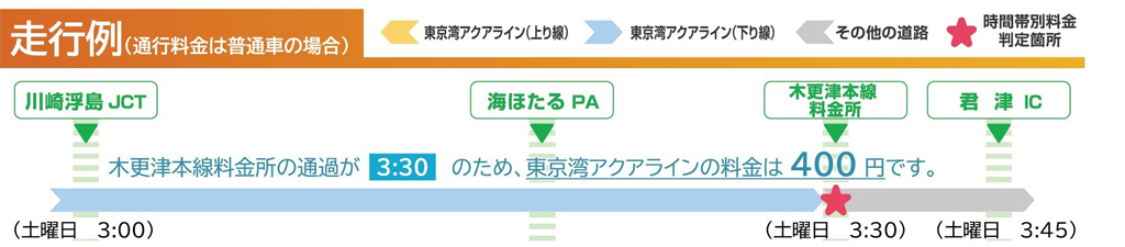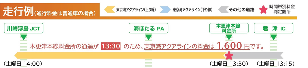 アクアラインの料金をお支払いいただく木更津本線料金所又は木更津金田ICを通過した日時により時間帯別料金の判定を行います。