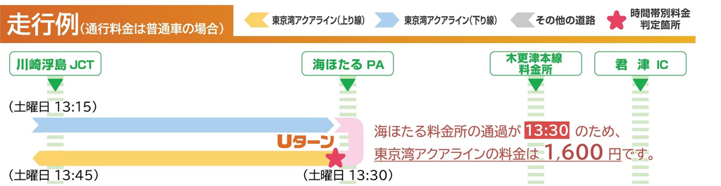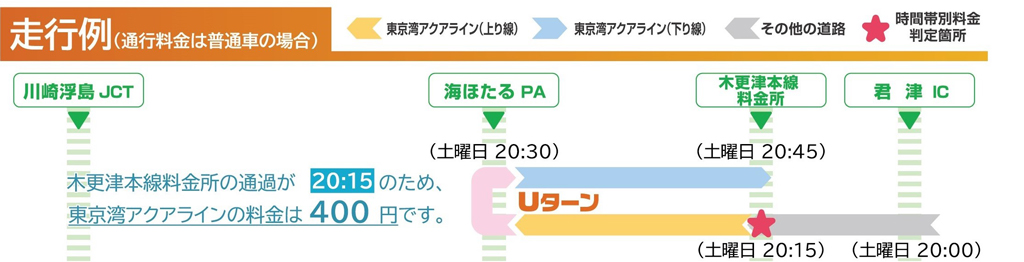 Uターン走行の料金は木更津金田ICから出発された場合は木更津金田ICを通過した日時、川崎浮島IC・JCTから出発された場合は海ほたる料金所を通過した日時により、それぞれ判定します。海ほたるPAでのUターン走行にETC時間帯別料金を適用する場合は、出発されたIC・JCTによらず上り線のETC時間帯別料金が適用されます。
