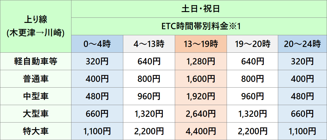 料金表(ETCアクアライン割引・ETC時間帯別料金)上り線のイメージ画像