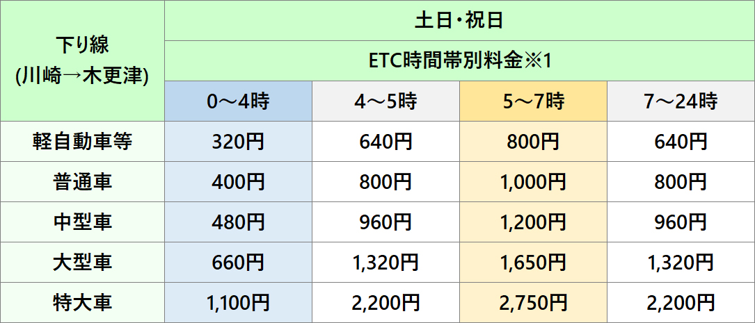 料金表(ETCアクアライン割引・ETC時間帯別料金)のイメージ画像