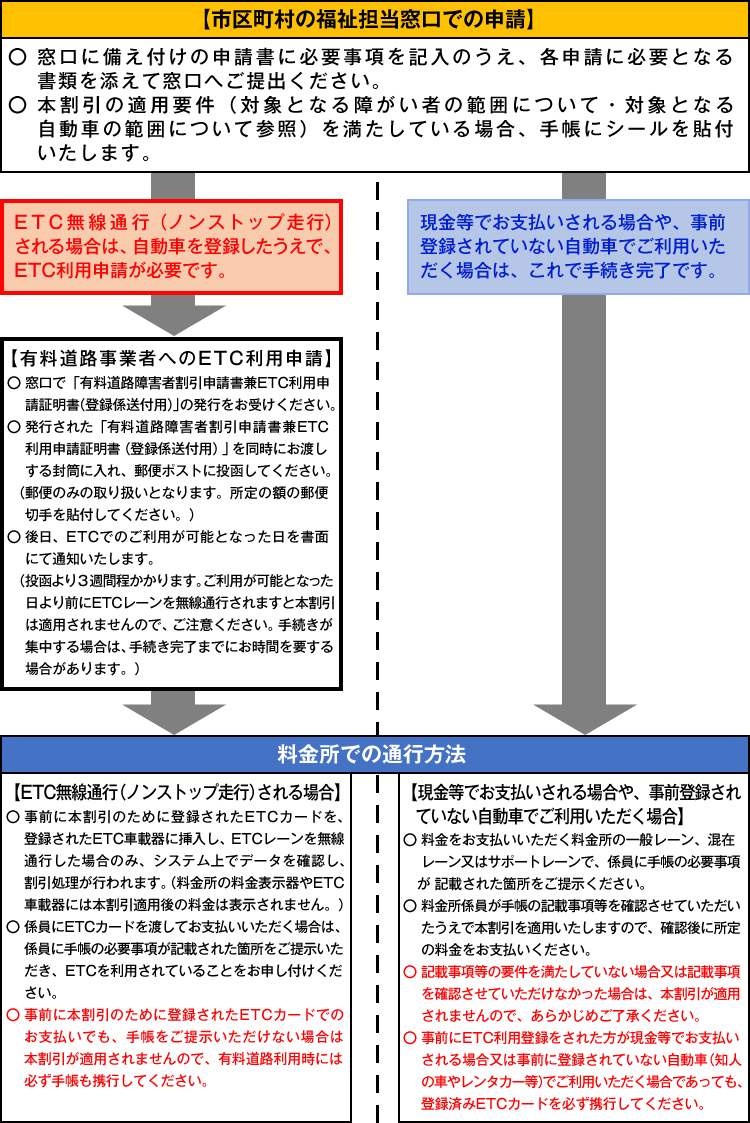 なお、手帳の記載事項等の要件を満たしていない場合又は記載事項等を確認させていただけなかった場合は、本割引が適用されません。また、事前にETC利用登録をされた場合は、登録済みのETCカードを料金所係員にご提示いただく場合がありますので登録済みのETCカードを必ず携行してください。- ETC専用レーンやスマートインターチェンジではご利用いただけませんので、あらかじめご了承ください。