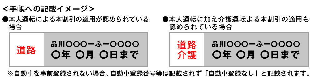 本割引の適用を受ける要件を満たしている場合は、身体障害者手帳の備考欄又は療育手帳の予備欄へ本割引の対象である旨(本人運転による本割引の適用が認められる場合は「道路」、本人運転に加え介護運転による本割引の適用も認められる場合は「道路介護」と赤字印字)、自動車を事前登録される場合は、自動車登録番号又は車両番号(以下、「自動車登録番号等」といいます。)及び割引有効期限を記載したシールを貼付いたします。