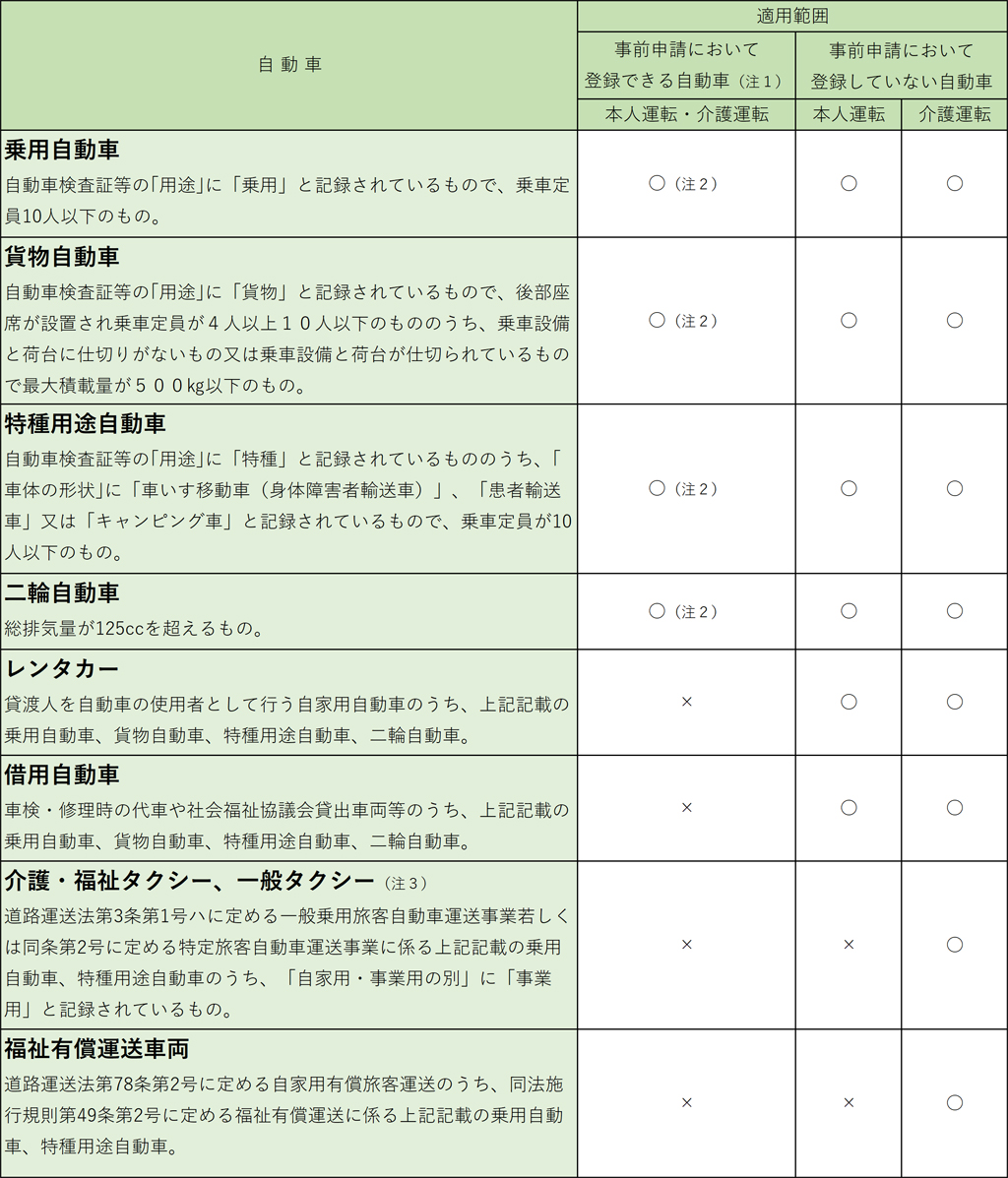 対象となる自動車は次表のとおりです。なお、次表のうち、介護運転として利用するタクシー以外については自動車検査証又は軽自動車届出済証(電子車検証を含む。以下、「自動車検査証等」といいます。)の「自家用・事業用の別」に「 自家用」と記録されている自動車が対象となります。(「事業用」と記録されている場合、対象となりません。)
