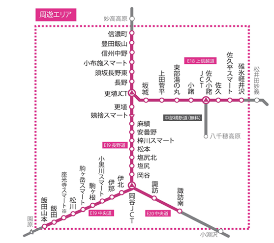 ※インフォメーションにて、駐車券をご持参のうえ「優待券画面」、「申込完了メール画面」または「申込完了メールを印刷したもの」をご呈示ください。なお、松井田妙義ICは周遊エリア外となりますので、ご利用されるICにはご注意ください。