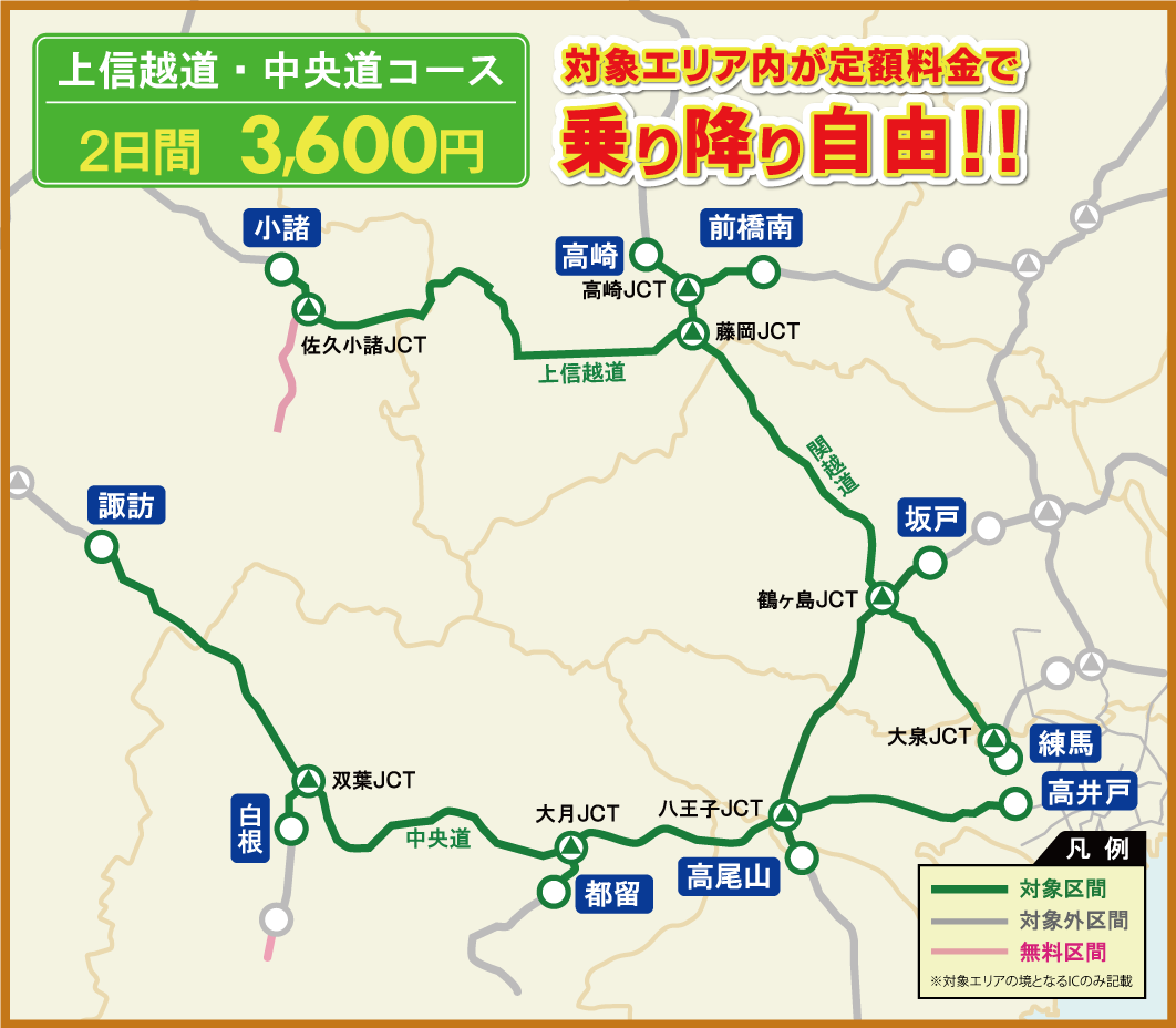 「上信越道・中央道コース」は、最大2日間、対象エリアの高速道路が定額で乗り降り自由となります。