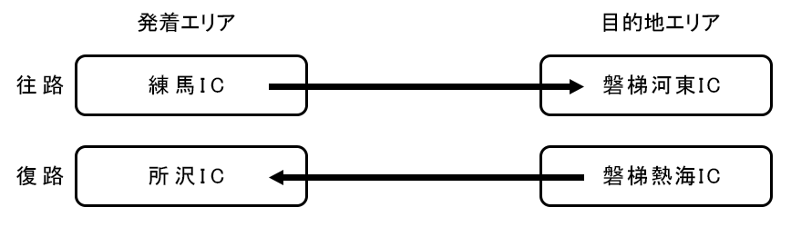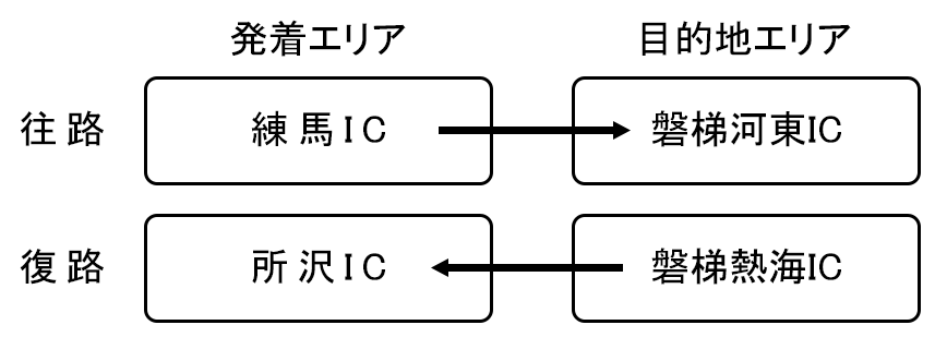 発着エリア内のICから乗って、目的地エリア内のICで降りる往路走行と、目的地エリア内のICから乗って発着エリア 内のICで降りる復路走行が対象です。