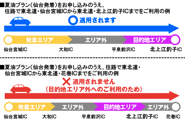 - ❶往路:発着エリア内のICから乗り、目的地エリア内のICで降りる。