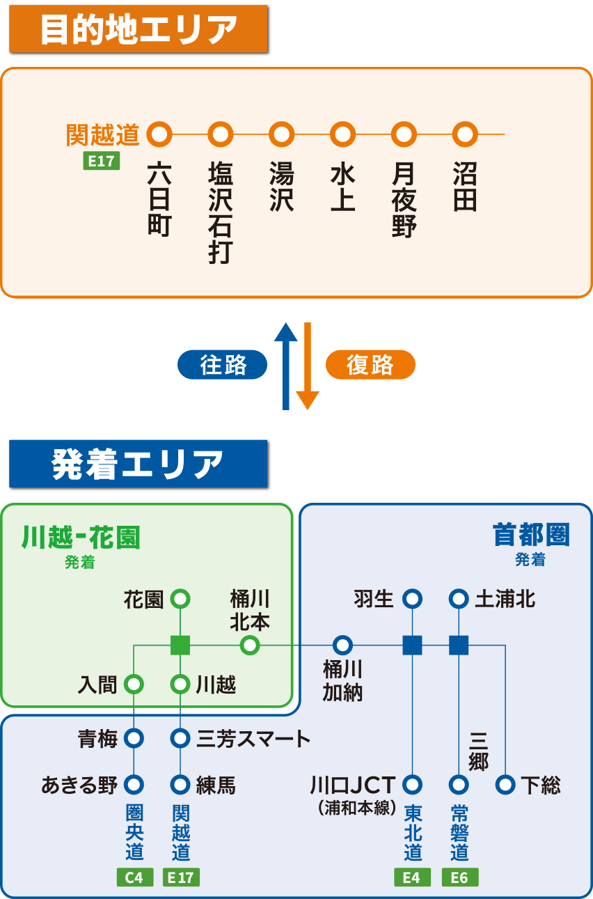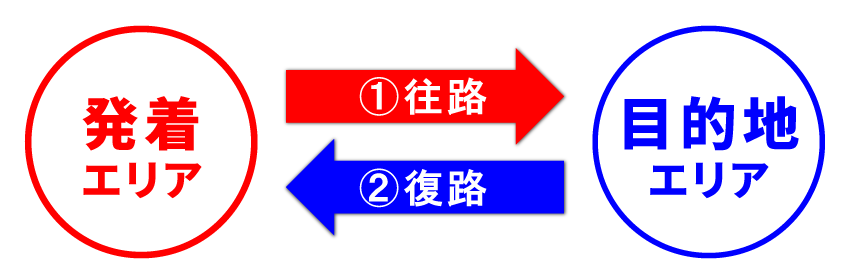 - ❷復路:目的地エリア内のICから乗り、発着エリア内のICで降りる。