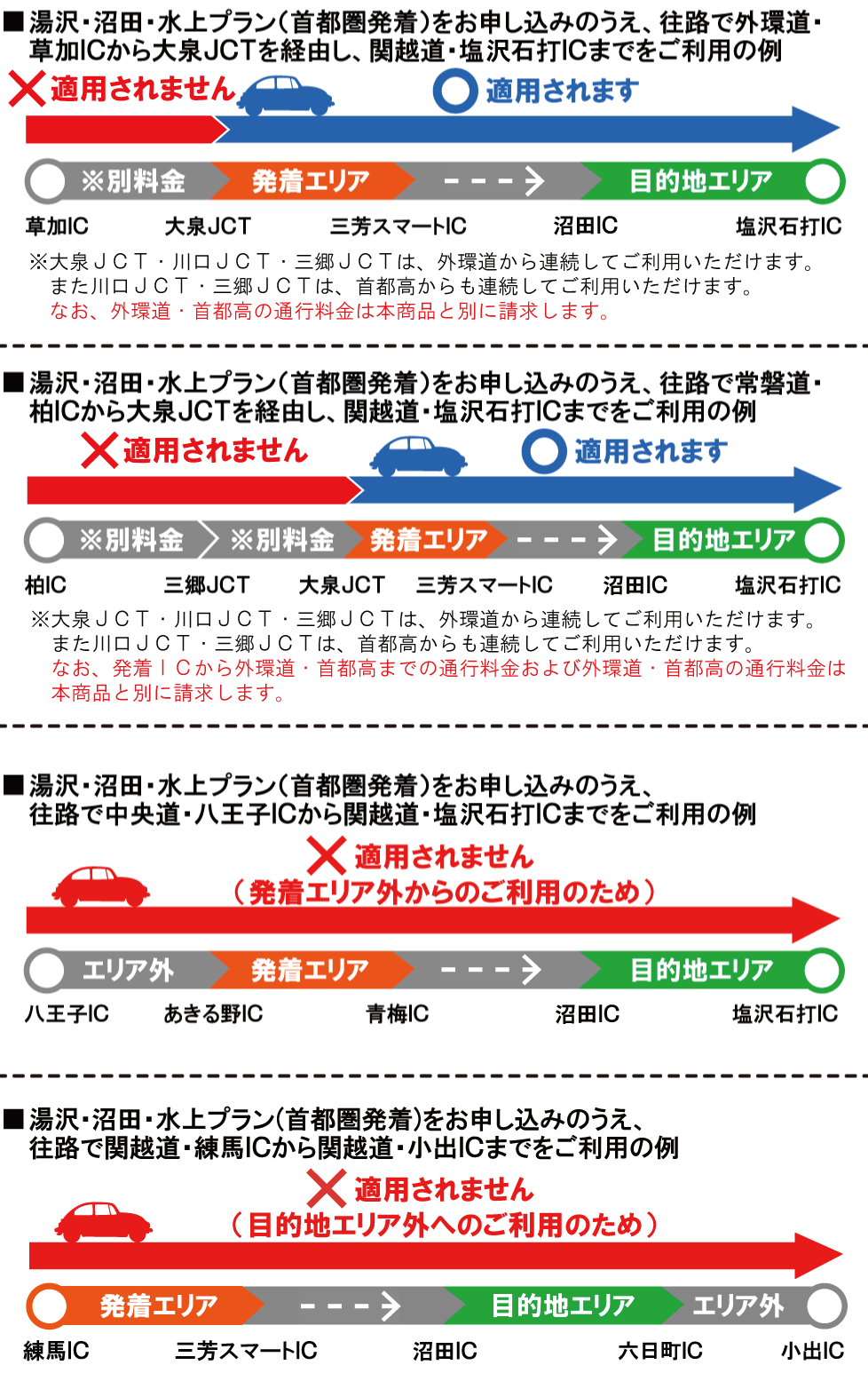 「湯沢・沼田・水上プラン(首都圏発着)」のご注意いただきたい走行例(普通車)