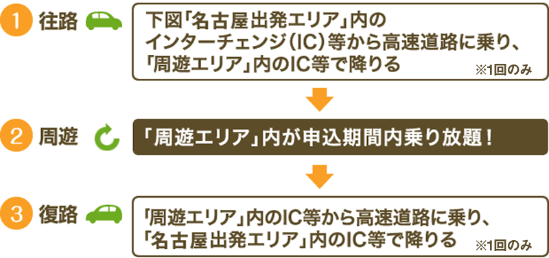 ※往路走行の要件を満たした時点で、本商品が適用となります。往路走行をされる前の周遊走行及び復路走行はフリーパスの対象外となります。