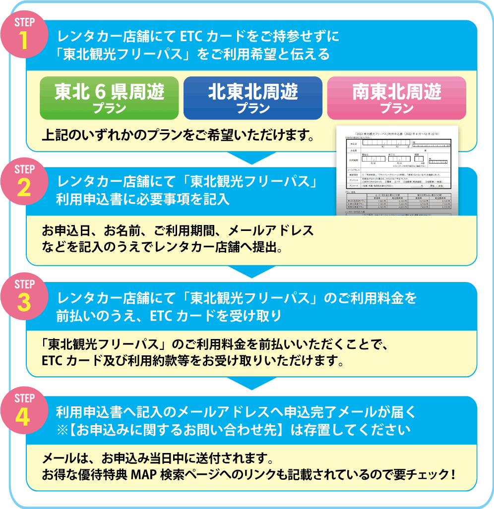 ニッポンレンタカー東北とトヨタレンタリース宮城の店舗にてレンタカーをお借りになる際に、次の手順にて、同時にお申込みください。