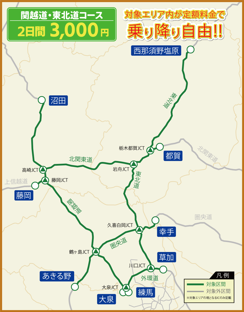 「関越道・東北道コース」は、最大2日間、対象エリアの高速道路が定額で乗り降り自由となります。