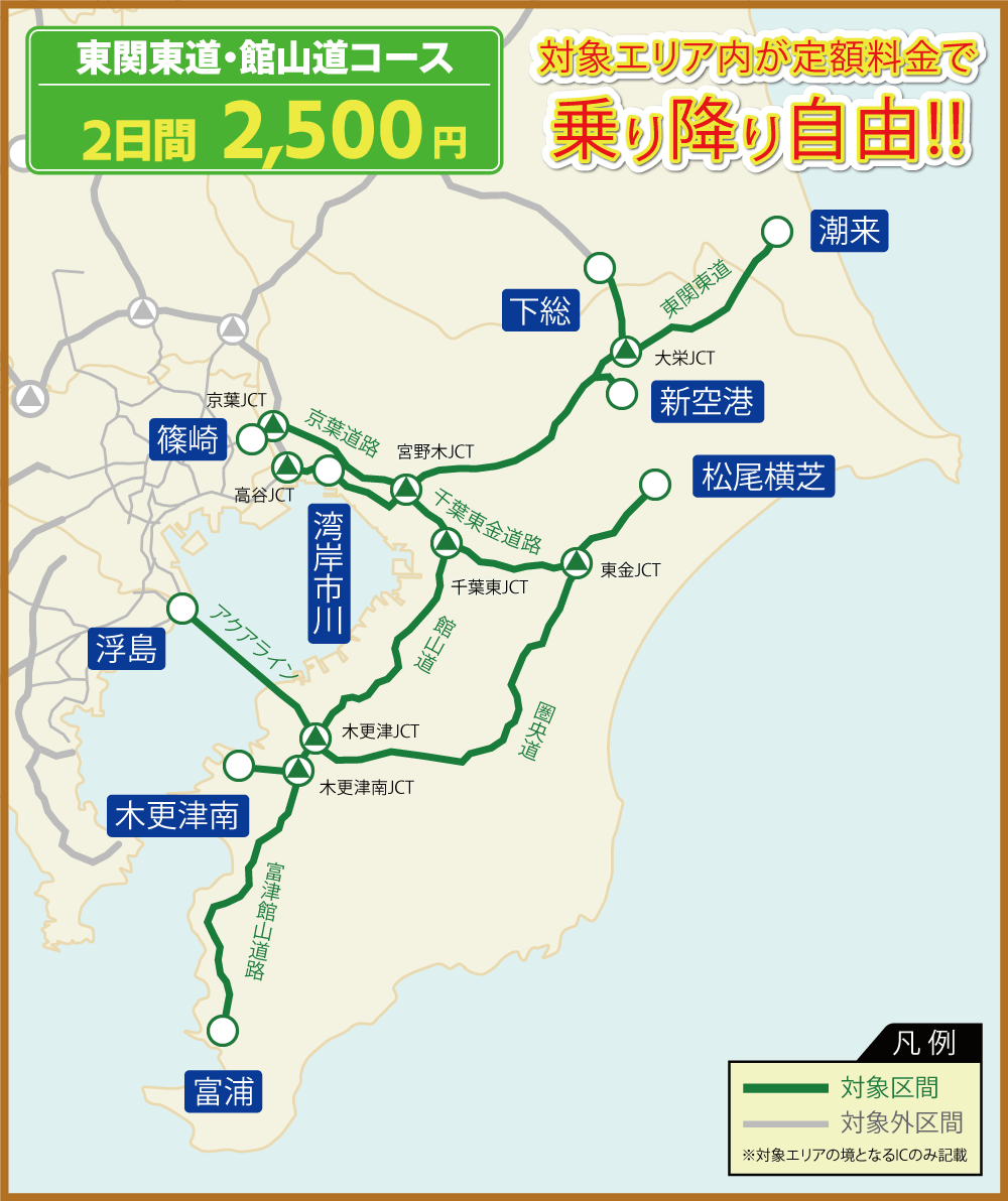 「東関東道・館山道コース」は、最大2日間、対象エリアの高速道路が定額で乗り降り自由となります。