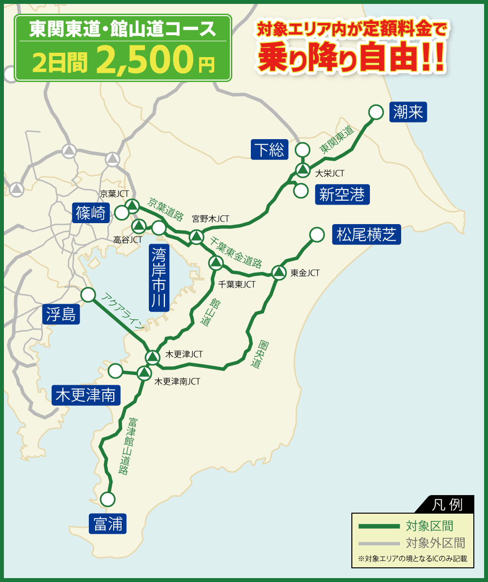 「東関東道・館山道コース」は、最大2日間、対象エリアの高速道路が定額で乗り降り自由となります。