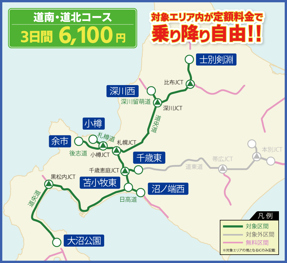「道南・道北コース」は、最大3日間、対象エリアの高速道路が定額で乗り降り自由となります。