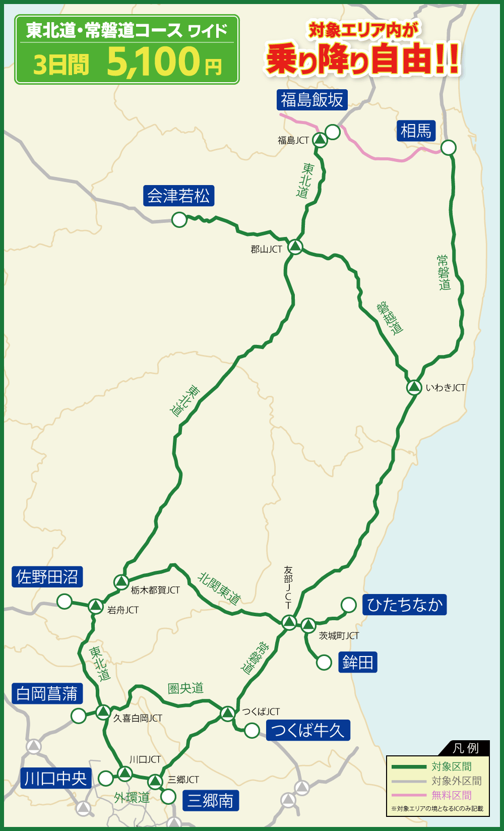 「東北道・常磐道コース ワイド」は、最大3日間、対象エリアの高速道路が乗り降り自由となります。