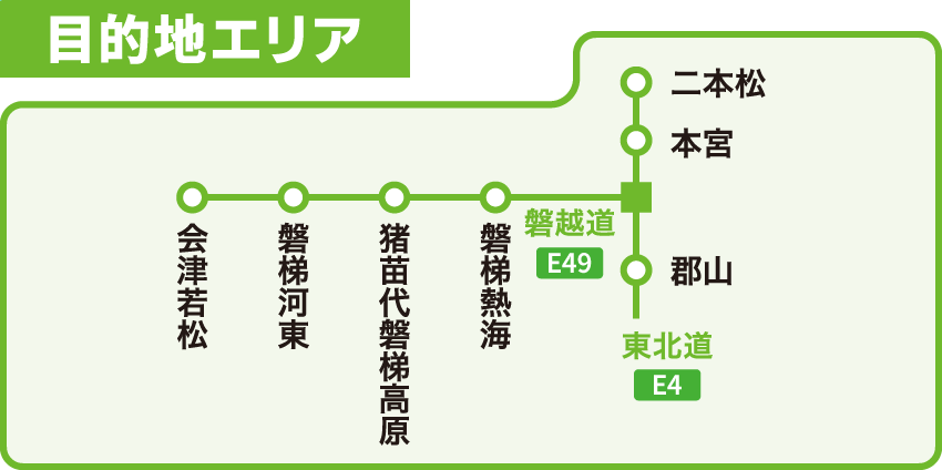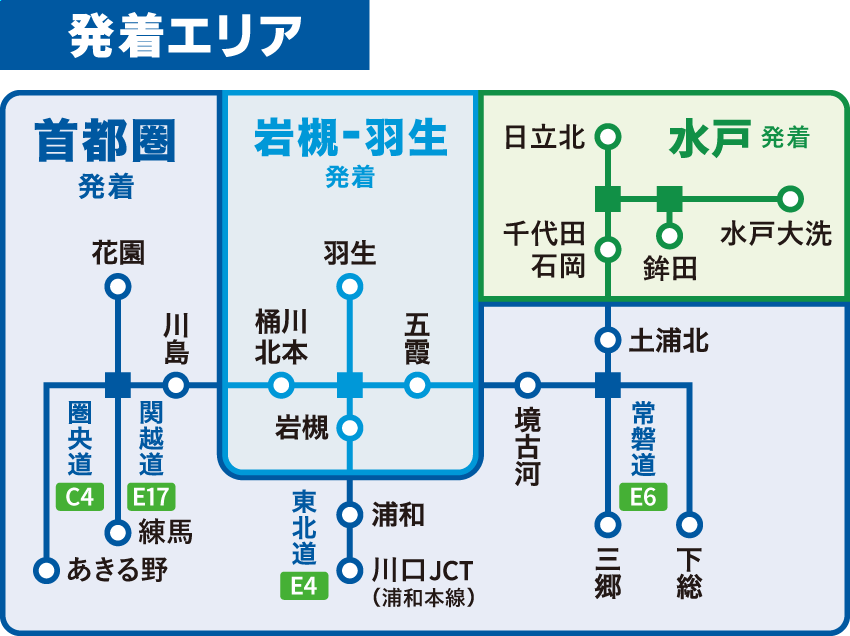 ①② 発着エリア外からの走行や目的地エリア外への走行は、往路走行の適用外となります。ただし、首都圏発着プランに限り三郷JCT・川口JCT・大泉JCTは首都高速、東京外環道から連続してご利用いただけます。