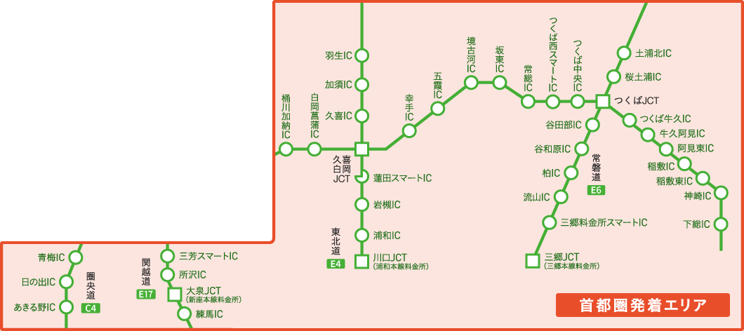 ①② 発着エリア外からの走行や目的地エリア外への走行は、往路走行の適用外となります。ただし、首都圏発着プランに限り三郷JCT・川口JCT・大泉JCTは首都高速、東京外環道から連続してご利用いただけます。