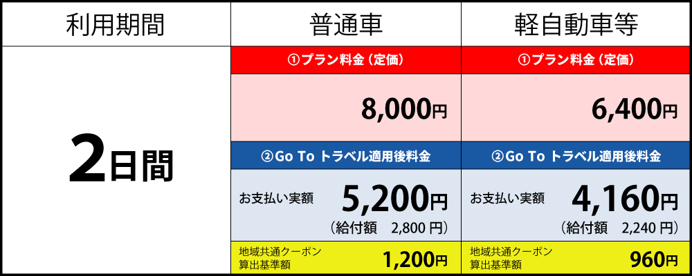 周遊パス プラン料金 7,000円 ⇒ 〇:お申し込み可能です  (70,000円+ 7,000円)÷(2人×1泊)=38,500円