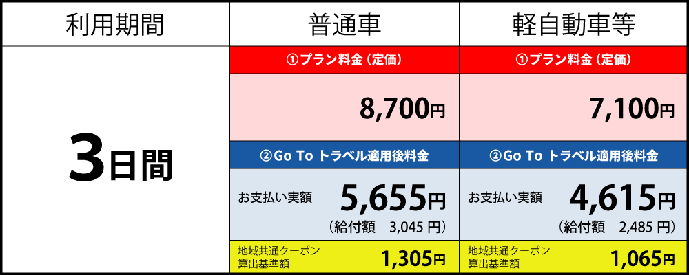 • ※ご利用区間や曜日・時間帯によっては、ETC時間帯割引をご利用いただくほうが割安となる場合がございます。ETC時間帯割引は以下をご確認ください。料金・割引・ETC