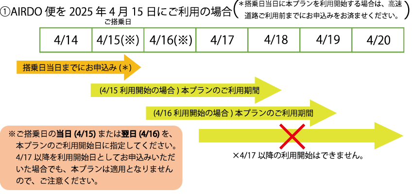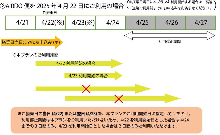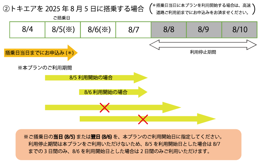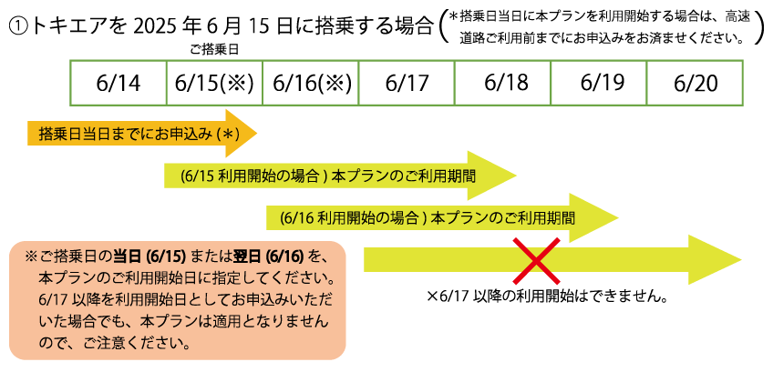 なお、お申込みは搭乗日当日までとなりますが、搭乗日当日から本プランをご利用開始になる場合は、高速道路のご利用前までにお申込みをお済ませください。また、お申込みの際、本プランのご利用開始日を搭乗日の当日または翌日としてください。