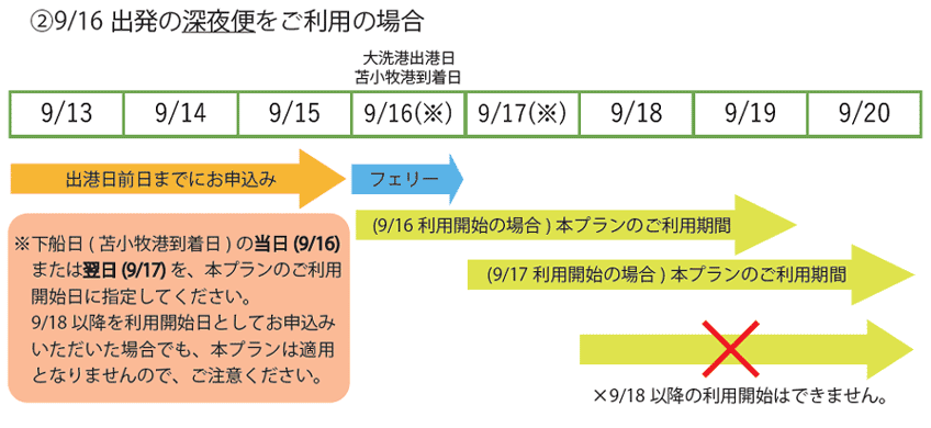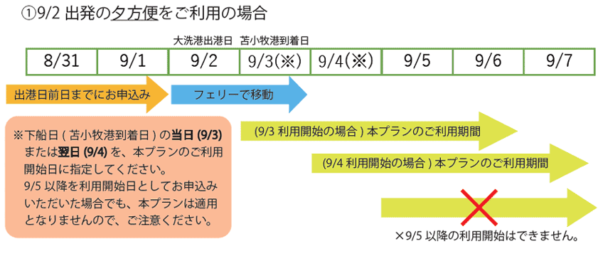 商船三井さんふらわあのホームページより、苫小牧行きの便をご予約ください。フェリーのご予約後に届く予約完了メールに本プランの申込み用URLが記載されておりますので、URLよりご予約ください。